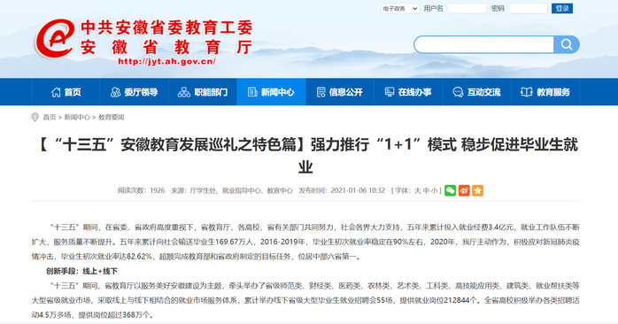 近期,省教育厅官网推出“十三五”安徽教育发展巡礼报道之特色篇《强力推行“1+1”模式 稳步促进毕业生就业》,报道中多次提及我校的就业创业工作措施和成效。