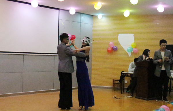 伴随着渐暗的天色,参加活动的同学们陆续到达,挑选自己喜爱的面具。随后,舞会正式开始。本次舞会共分为表演、寻伴共舞、魔术、游戏和抽奖五个环节。其中,在寻伴共舞环节中,舞者先跟随视频现场学习华尔兹,之后同舞伴共舞。戴着面具的同学们毫不羞涩,纷纷展现自己,伴着唯美的音乐同舞伴一起跳起优雅的华尔兹。在“正话反说”游戏中,参赛者将主持人说出的一个词语反着说出,如果说错或反应时间过慢,即被淘汰。现场同学积极参与,台下不时爆发出一阵阵大笑声与欢呼声。此外,还有“夫妻双双把家还”等游戏与抽奖环节赢得在场同学们的好评。最后,伴随着“left,left,right,right,go,go,go”的欢快音乐声,在场观众围成圆圈,一起跳可爱的兔子舞。舞会在一片掌声中圆满结束。