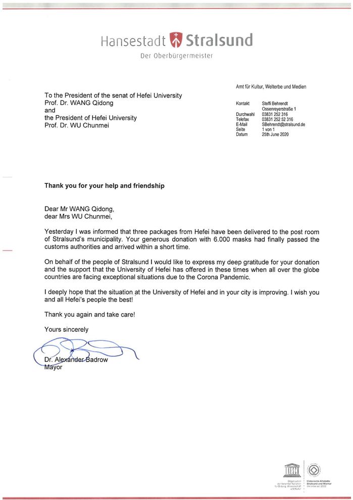 Kürzlich schrieb der Bürgermeister von Stralsund, Herr Dr. Alexander Badrow, im Namen der Stadtregierung und der Bürger an den Parteisekretär unserer Universität, Wang Qidong, und die Präsidentin Wu Chunmei, und dankte unserer Universität aufrichtig für die Spende von 6000 medizinischen Masken an die Stadt. Er wünschte allen Lehrkräften und Studierenden unserer Universität und allen Bürgerinnen und Bürgern von Hefei alles Gute.