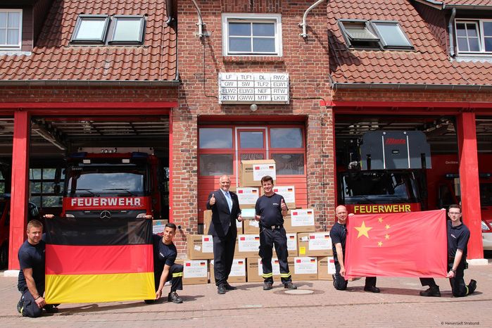 Die Stadtregierung von Stralsund hielt eine einfache und feierliche Empfangszeremonie ab. Der Bürgermeister Herr Badrow und das Notfallmanagementteam der Stadt hielten die Nationalflaggen Chinas und Deutschlands und dankten den chinesischen Freunden für ihre Unterstützung. Die Webseite der Stadtregierung und viele lokale Medien berichteten darüber. Die der Stralsund-Zeitung veröffentlichte am 28. Juni einen Bericht mit dem Titel Chinesische Stadt Hefei und Universität Hefei spenden weitere Schutzmasken für Stralsund und dankte für die großzügige Unterstützung unserer Universität im kritischen Moment der Epidemie.