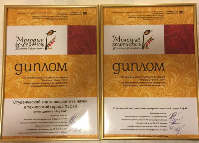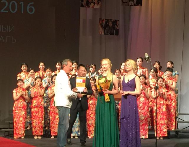 闭幕式上,18支合唱团依次上台表演。我校合唱团与俄罗斯著名合唱团莫斯科室内合唱团同台演出,许刚与国际著名指挥Vladimir L. Zhivov同台指挥。代表团演唱了俄语民歌《卡林卡》,活泼的旋律,欢快的舞台表现,全场观众和着节拍鼓掌配合,台上台下共同演绎歌曲中的欢快旋律,把现场气氛共同推向高潮。演唱完毕现场掌声雷动,持久不息。由于此次艺术节上的精彩表现,组委会现场为我校代表团颁发了奖牌,许刚获俄罗斯第十五届“青春之声”国际合唱艺术节合唱指挥最高奖,奚溪同学获钢琴伴奏最高奖。(团委)