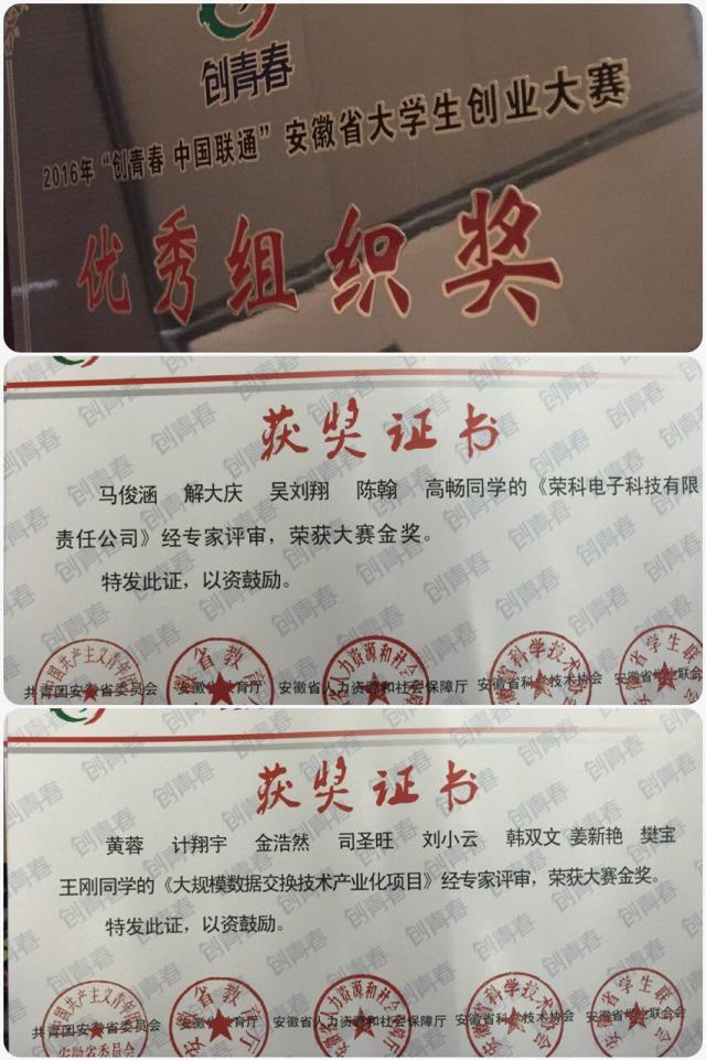 在安徽省终审决赛上,我校7项项目作品与全省37所高校的126件入围作品展开激烈角逐,经过作品展示、评委评审、秘密答辩,最终张家锐、邹乐老师指导的《大规模数据交换技术产业化项目》、尹奇异、董强老师指导的《荣科电子科技有限公司》两个项目荣获创业计划大赛金奖,并将代表安徽省参加“创青春”2016年全国大学生创业大赛。