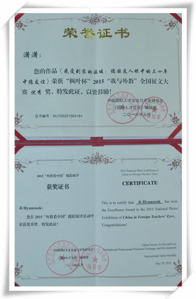 本届“我与外教”大赛活动,由基础教育领域国际教育的领军品牌——中国枫叶教育集团冠名协办,全国各地外专局、教育局及各有关学校单位积极响应参与。本着公平公正的原则,大赛活动组委会在组织专家对征文来稿和摄影作品进行严格、细致的初评和终评。对进入终评环节的摄影作品还在中国日报网上展示,并对100位外教的近200幅摄影作品在大赛活动官方微信平台进行“微信投票评选”,三周时间内微信投票数达到153940,访问量103万。最终评出征文类一等奖3名、二等奖20名、三等奖60名、优秀奖112名;摄影作品一等奖2名、二等奖9名、三等奖19名、优秀奖62名、“网络最佳人气奖”1名;优秀组织单位149家。来自我校宣传部潇潇老师的作品《感受到家的温暖:德国友人眼中的三十年中德友谊》荣获征文优秀奖,外教Ji Hyunsook荣获摄影评展活动优秀奖。随后第四届“国际化人才之路”论坛开启,业内专家发表讲话,嘉宾围绕“外教与国际化人才培养”这一主题,从外教来华讲学执教的重要作用和积极意义、如何使用好外教、如何做好外教服务等方面进行了互动分享。